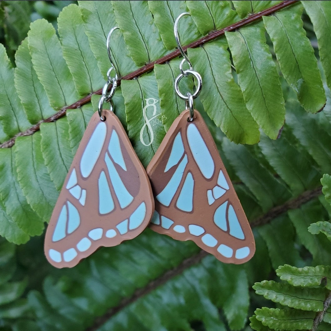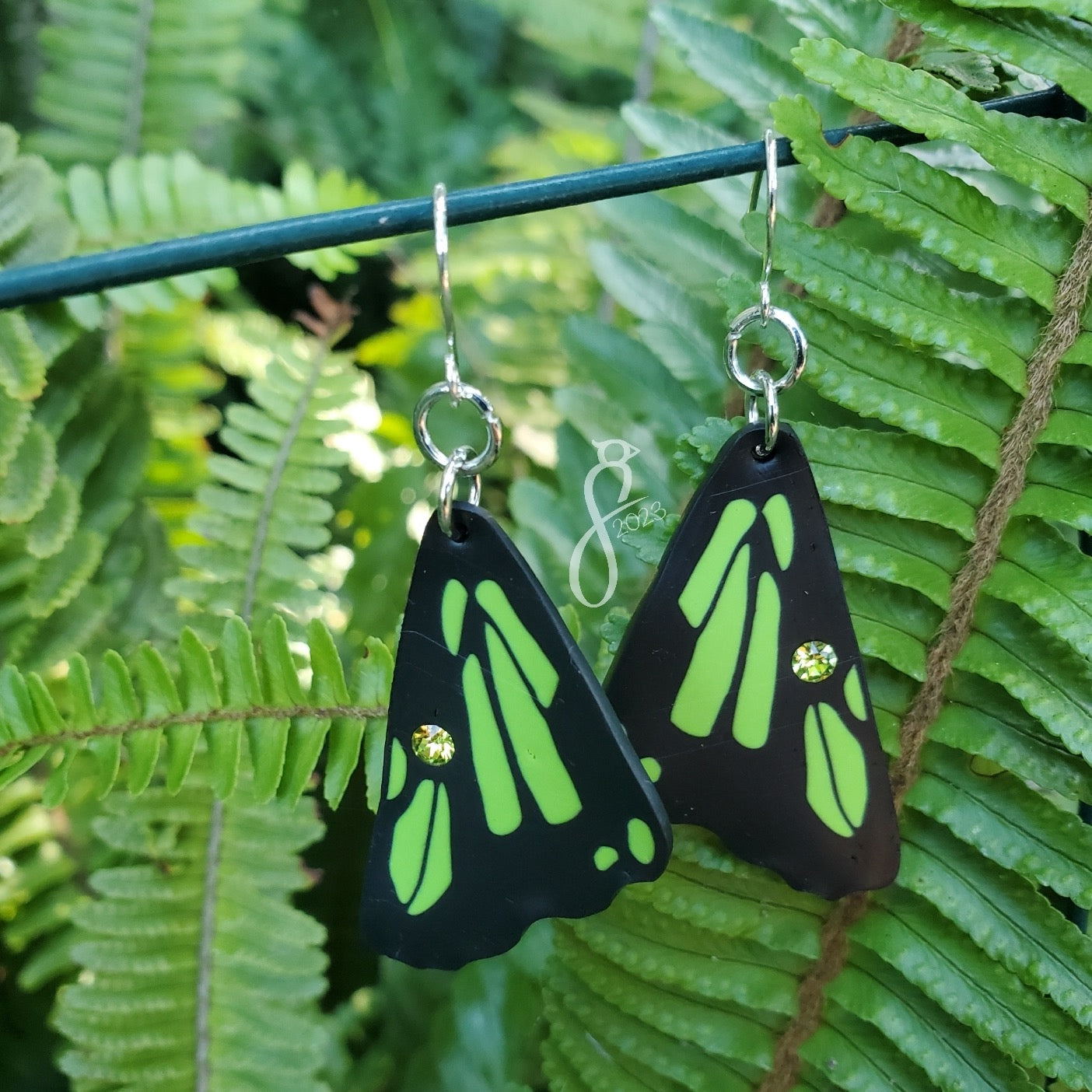 Add some green or teal flair with these malachite butterfly wings. Choose between the leaf-green top view, and the striking teal and brown underside. Each wing is handmade from polymer clay and features a double sided design. No matter how the wind blows them, these earrings will look lovely.
