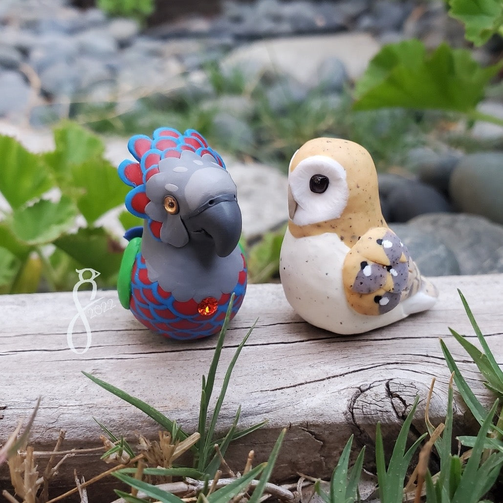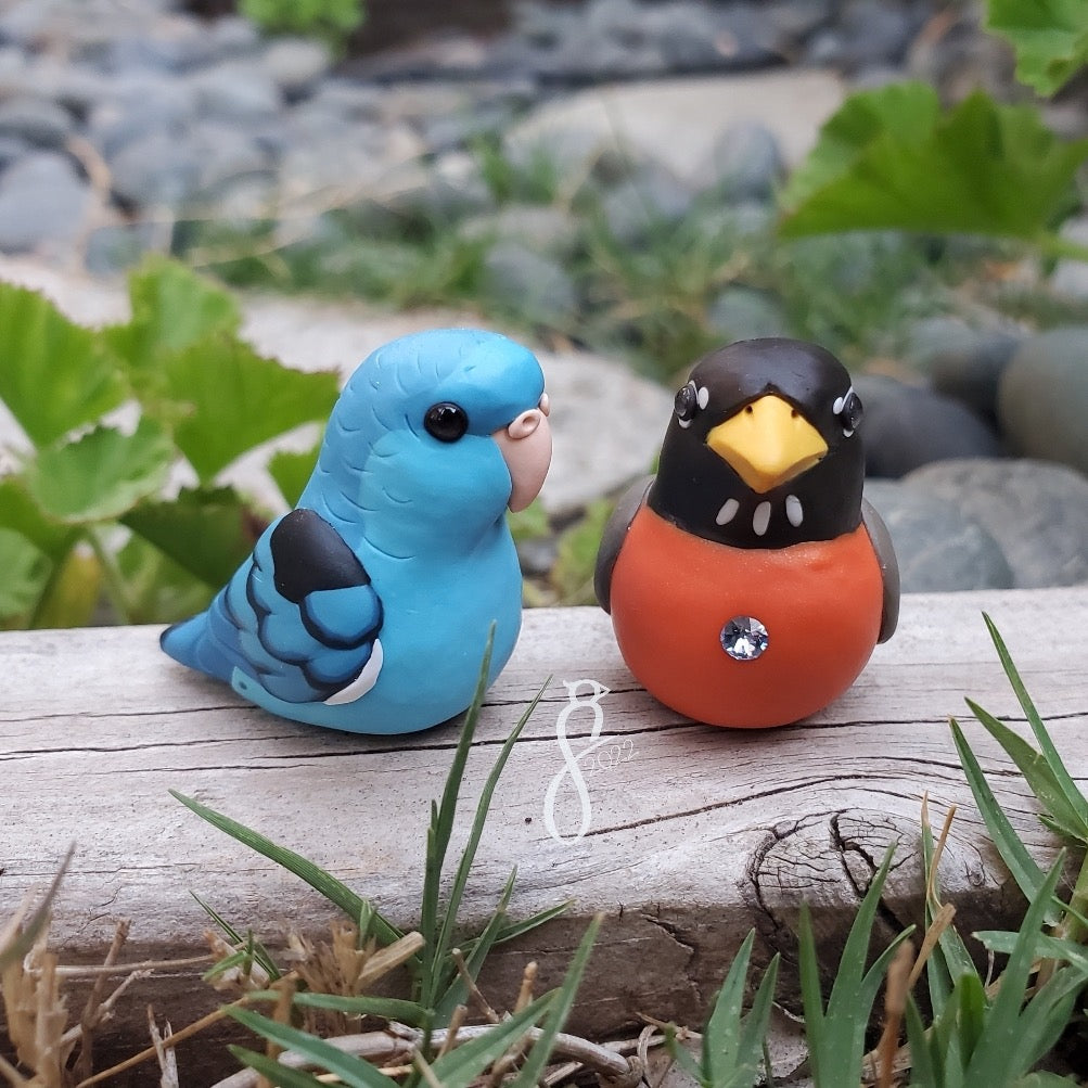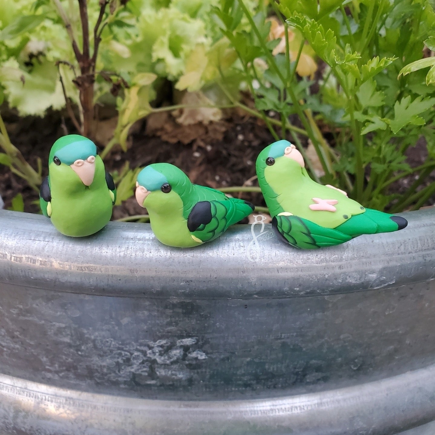 Customize a figurine based on your favorite bird! Choose from three poses: sitting, loaf (laying down), and upside down (feet in the air). Other personal features (like beak expression and head angle) can be placed in the description box. You can provide a photo or drawing of your bird as well.