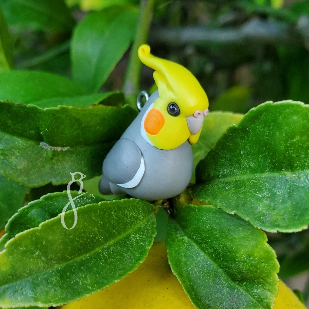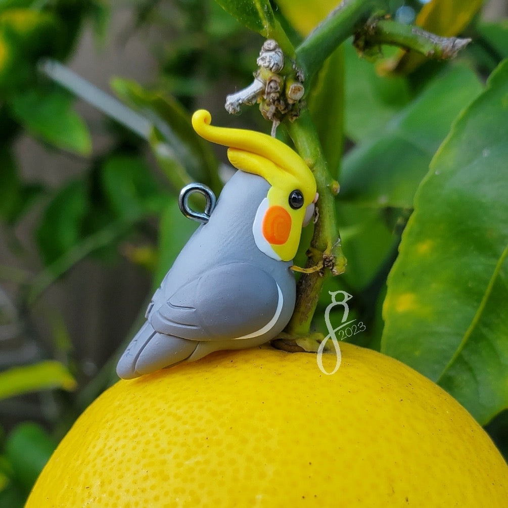 This cockatiel charm is ready for his next adventure. Take him with you as a pendant, or display him as a desk guardian.