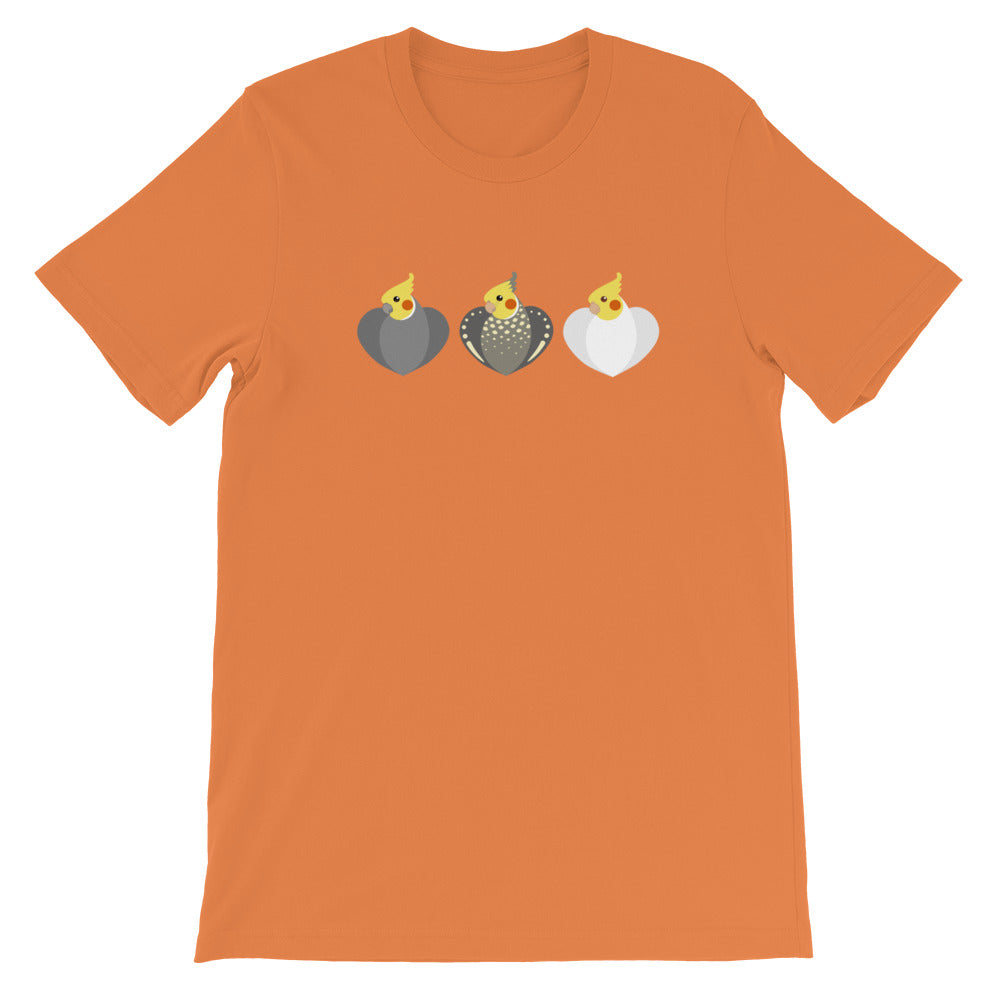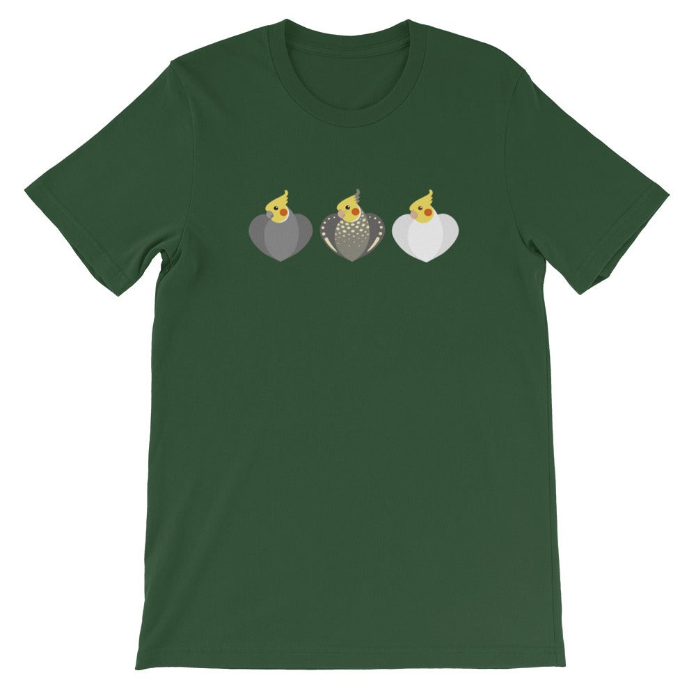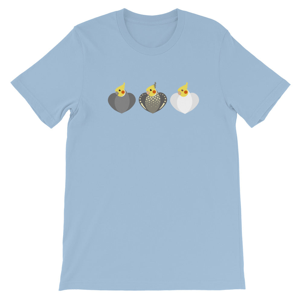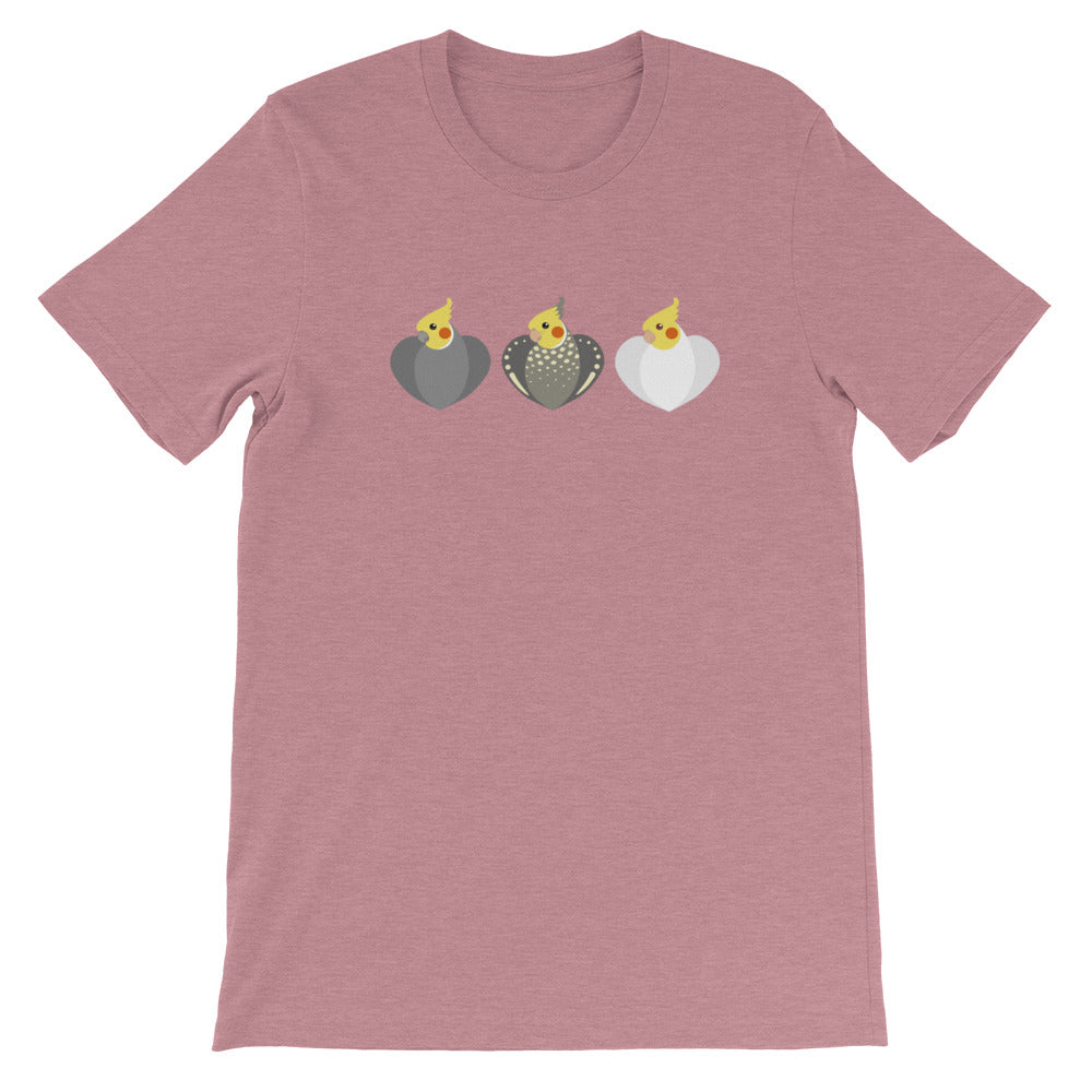 Show some cockatiel love with a heartwings cockatiel t-shirt! This design features a classic grey male, pearl female, and lutino.