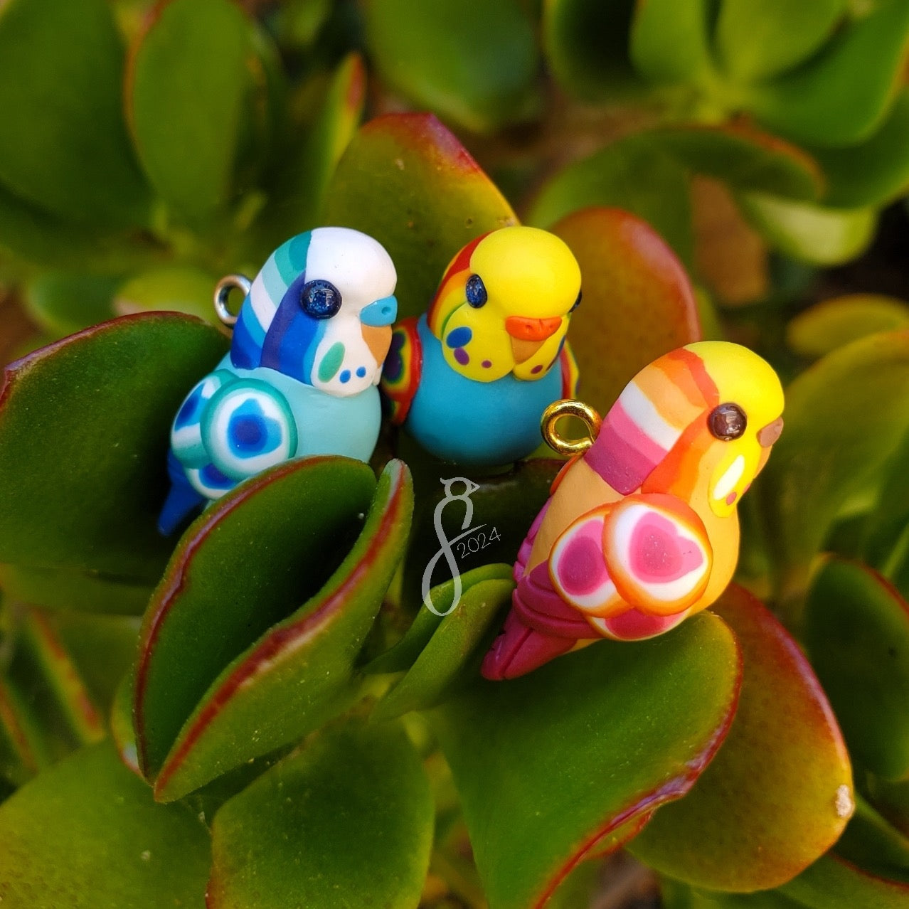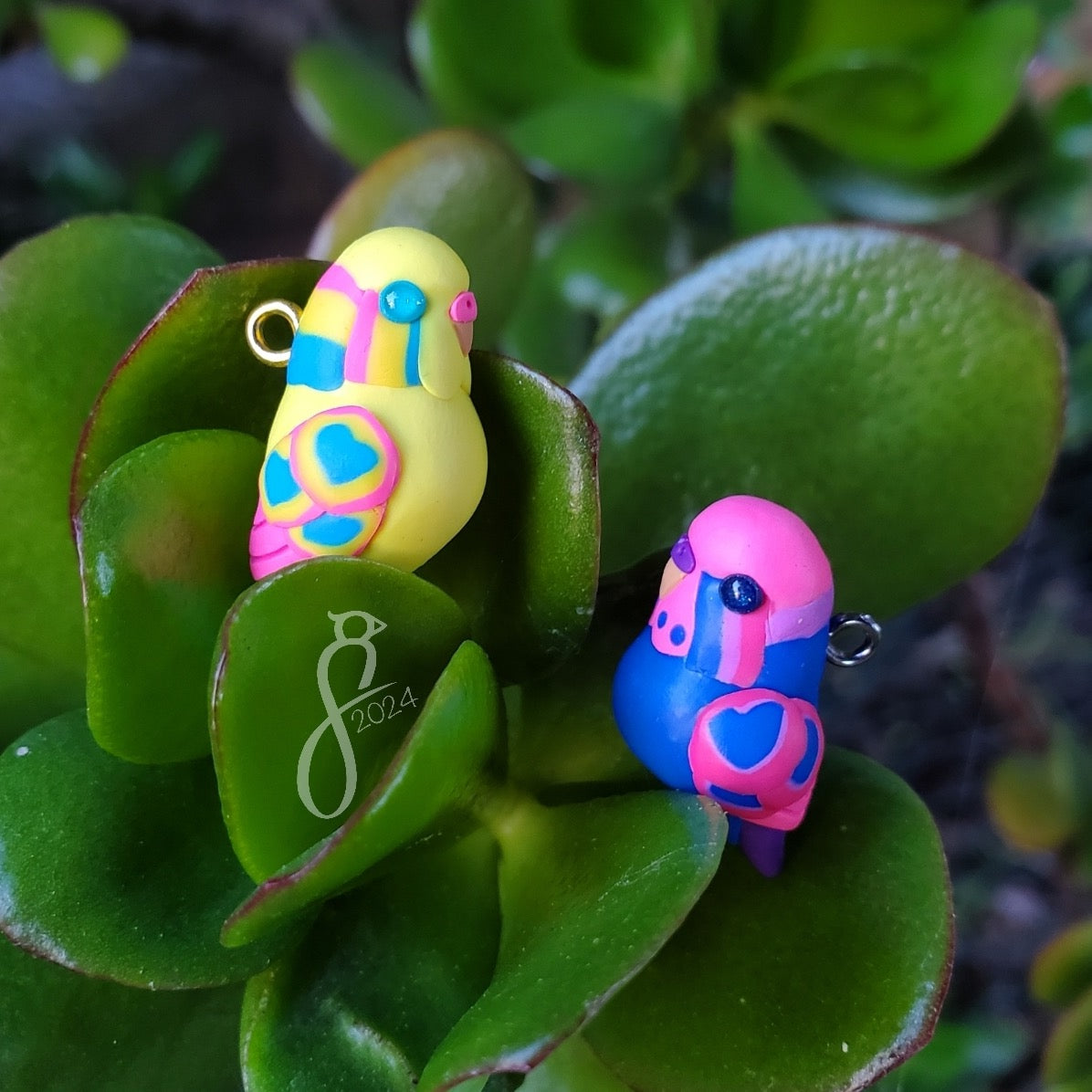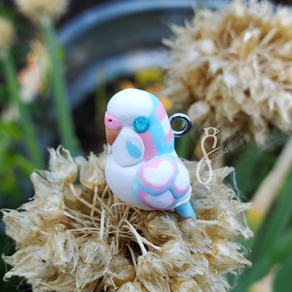 Showcase your pride with these colorful budgie charms! They can be worn on a necklace, bracelet, or earrings, carried on a keychain for a bag, or displayed on a desk.