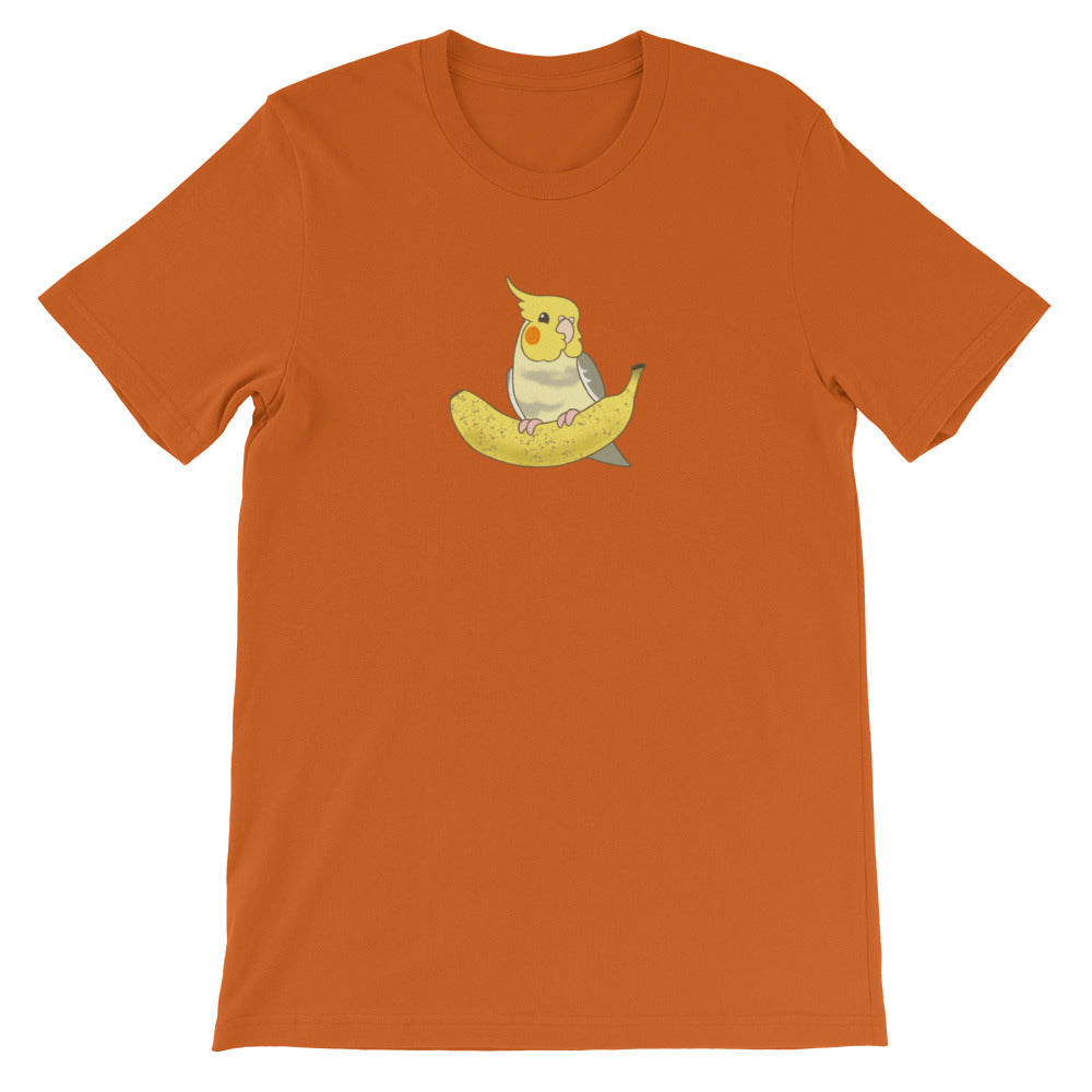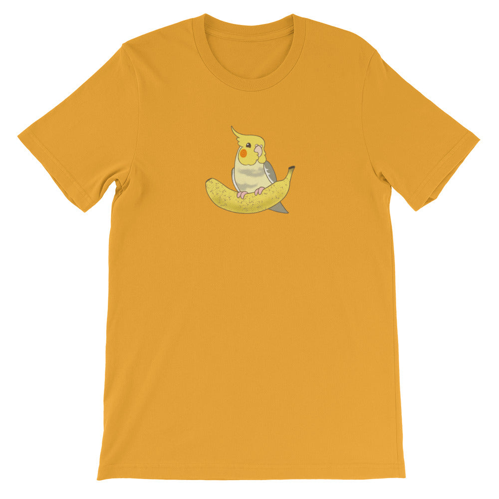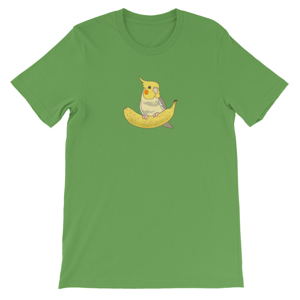 Showcase some cockatiel love with a casual shirt featuring a fluffy pied tiel perched on a banana!