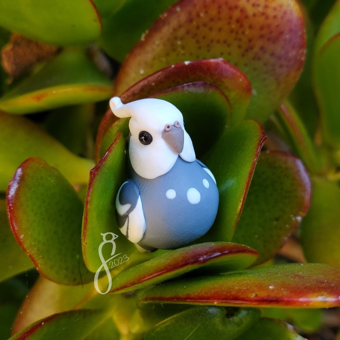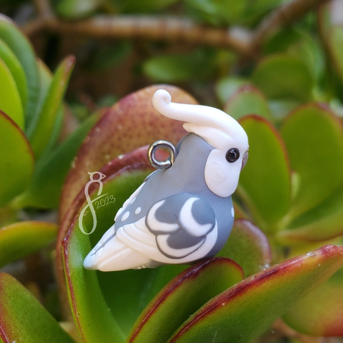 This cockatiel charm is ready for her next adventure. Take her with you as a pendant, or display her as a desk guardian.