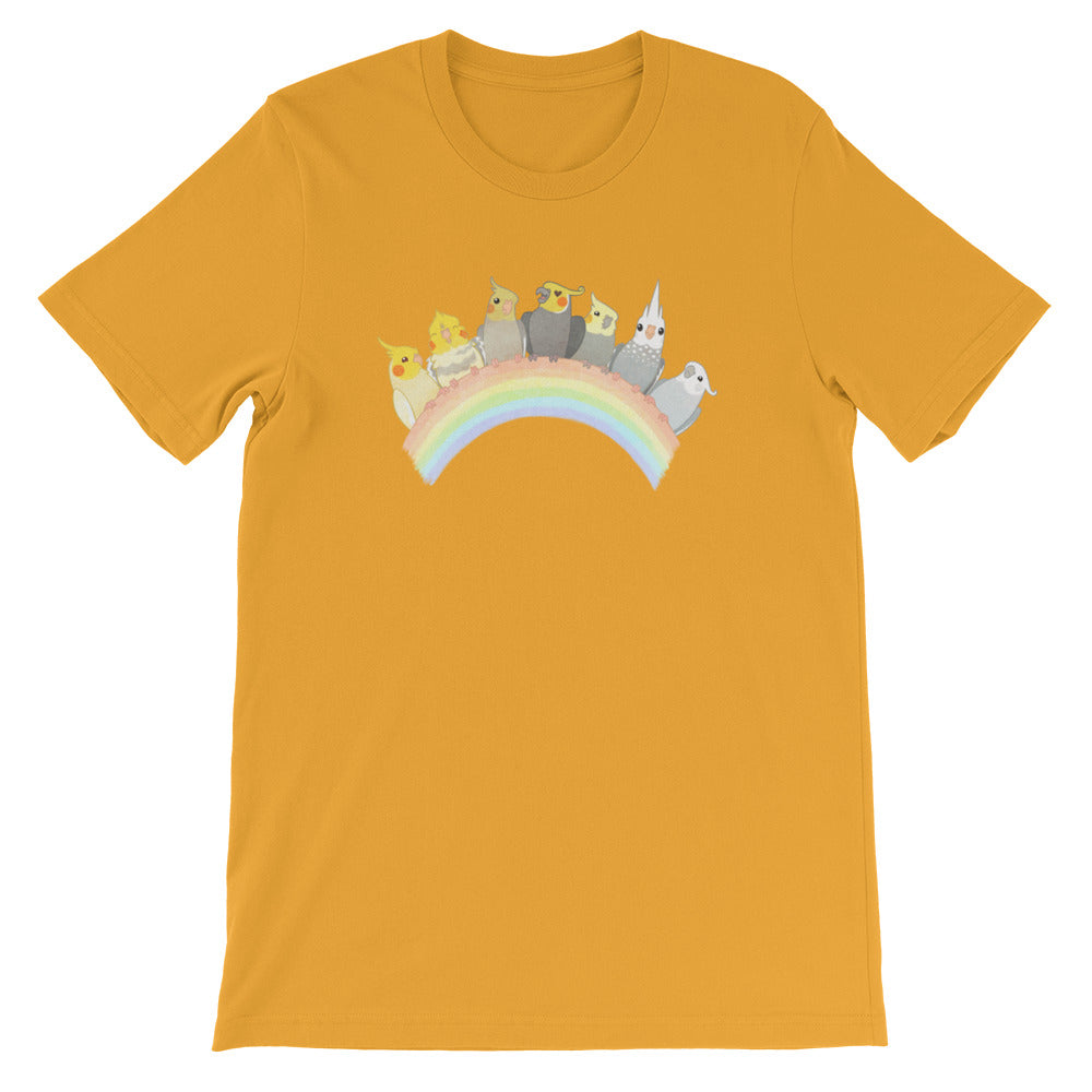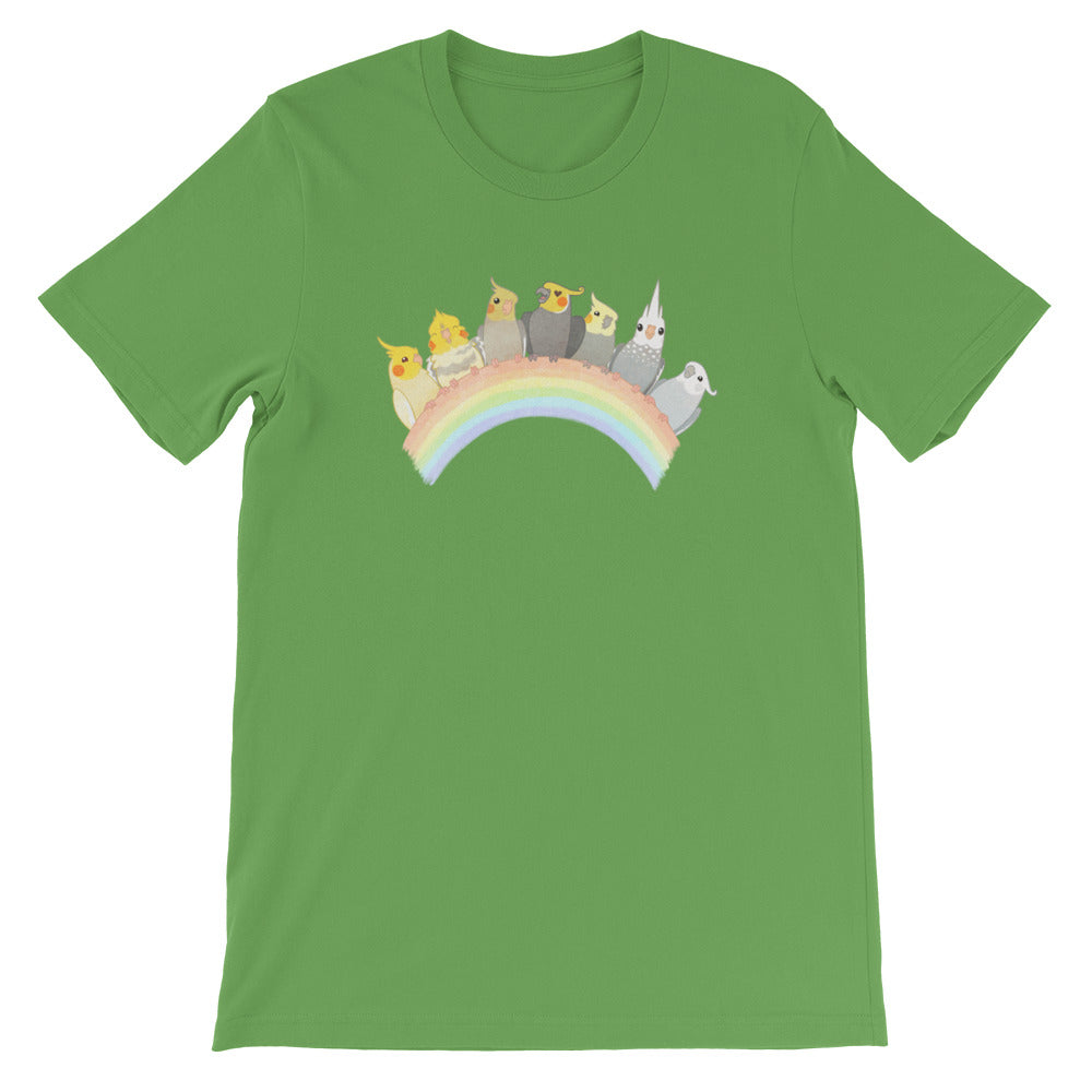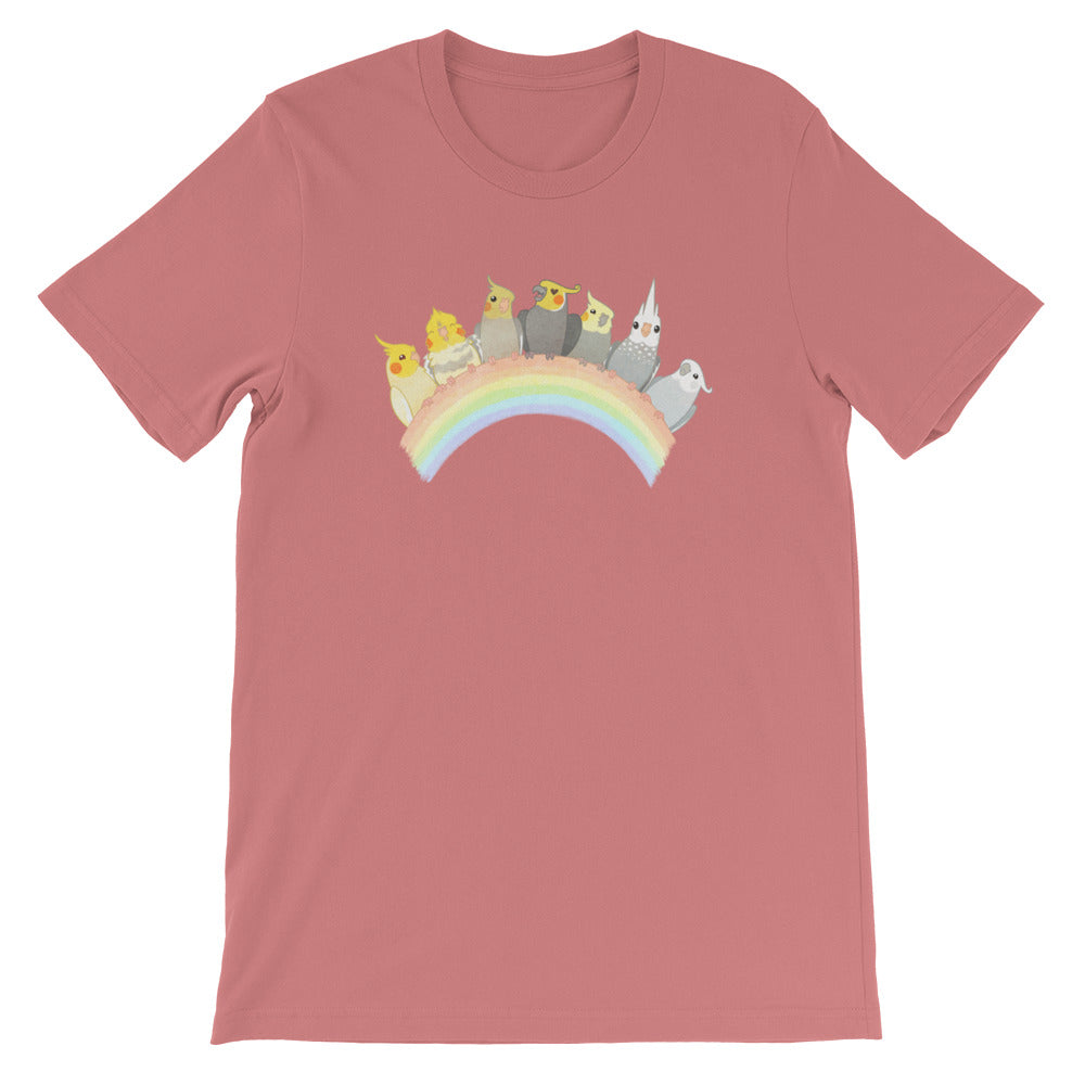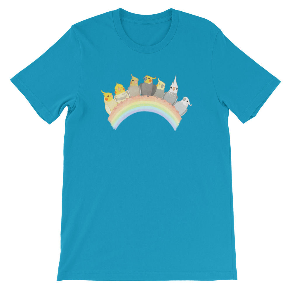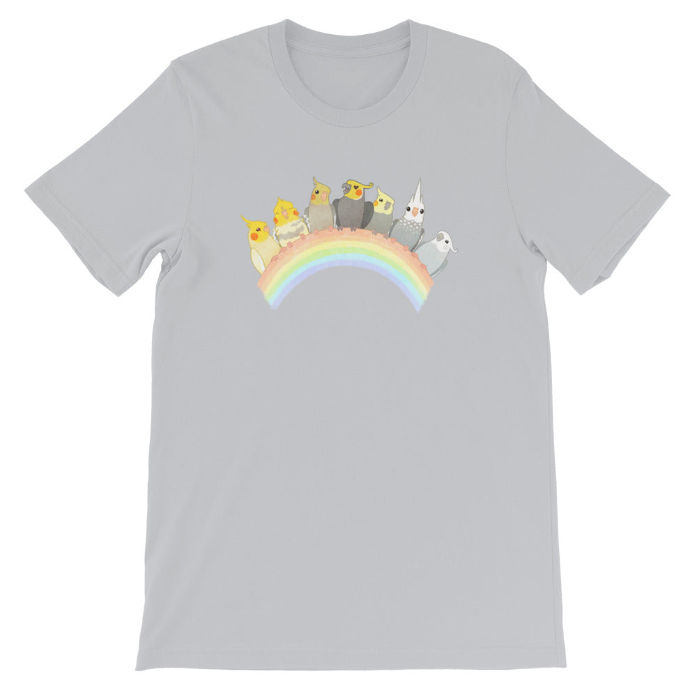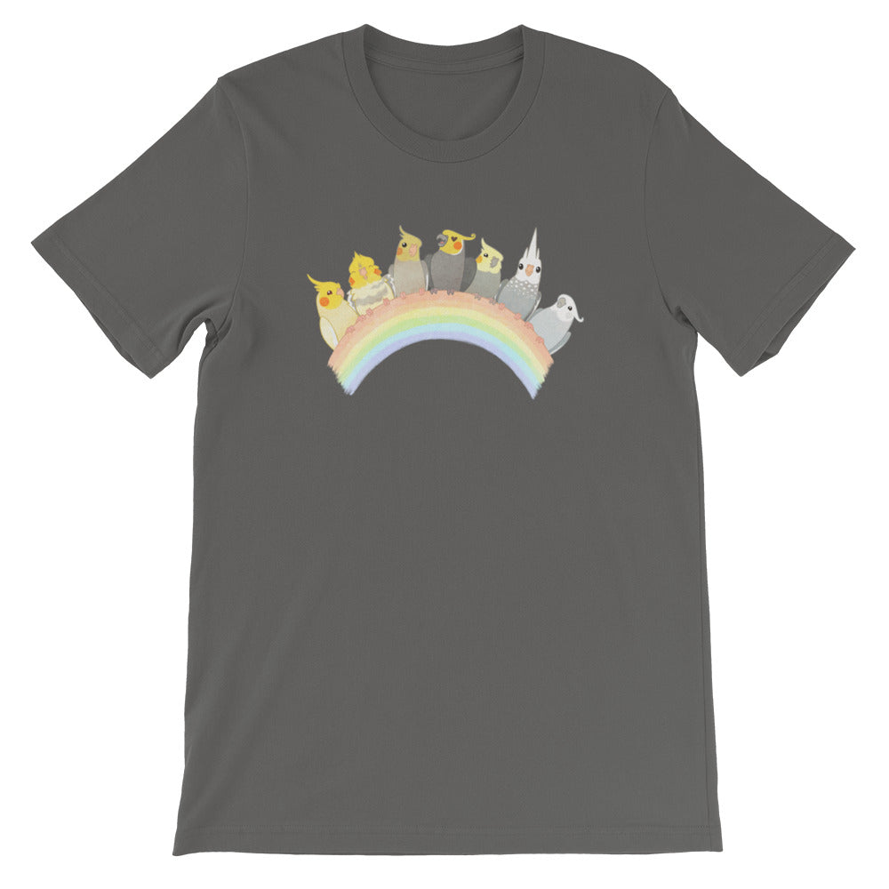 A colorful cockatiel flock perched on a pastel rainbow. Cockatiels may not be as bright as their fellow parrots, but they are still beautiful. Cockatiel colors depicted include yellow lutino, cinnamon pied, cinnamon, classic grey, pastel faced, grey pearl, and silver.