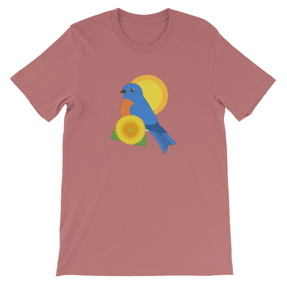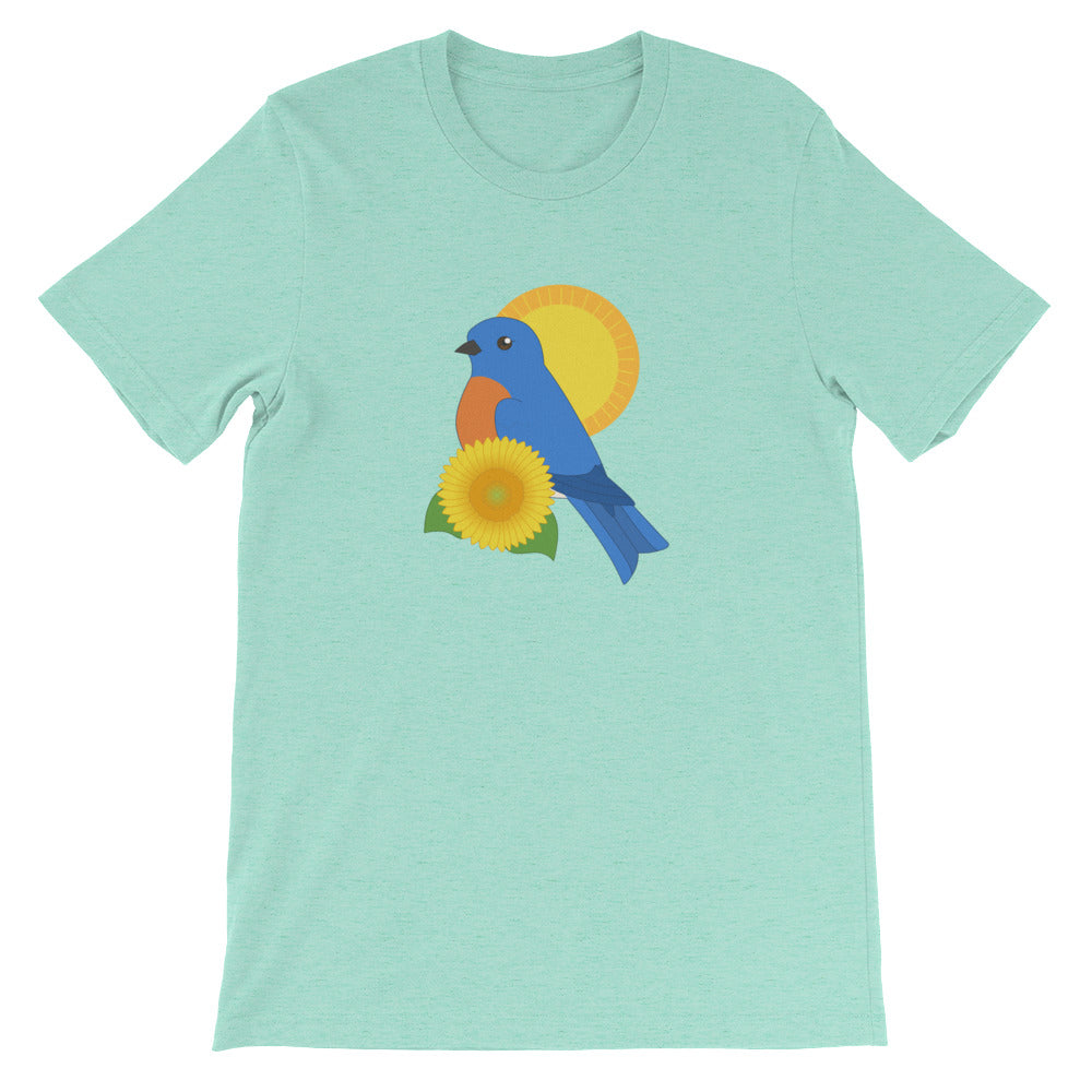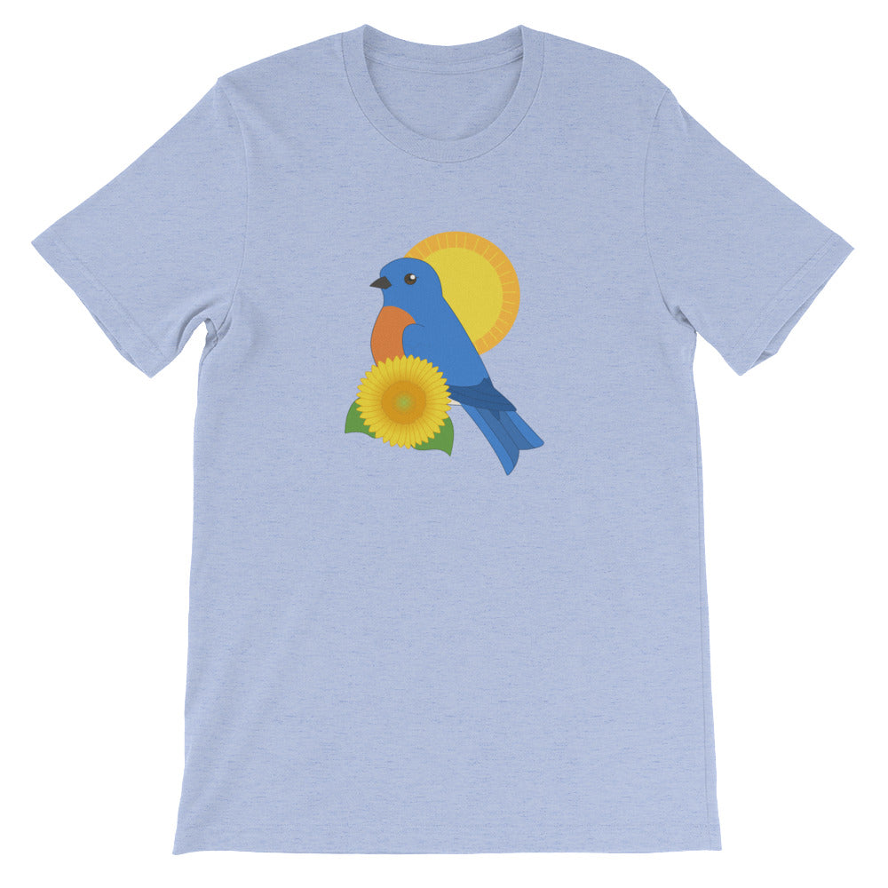 Are you an early bird or a night owl? Showcase your lifestyle with this t-shirt featuring a cute bluebird perched in front of a bright yellow sun.