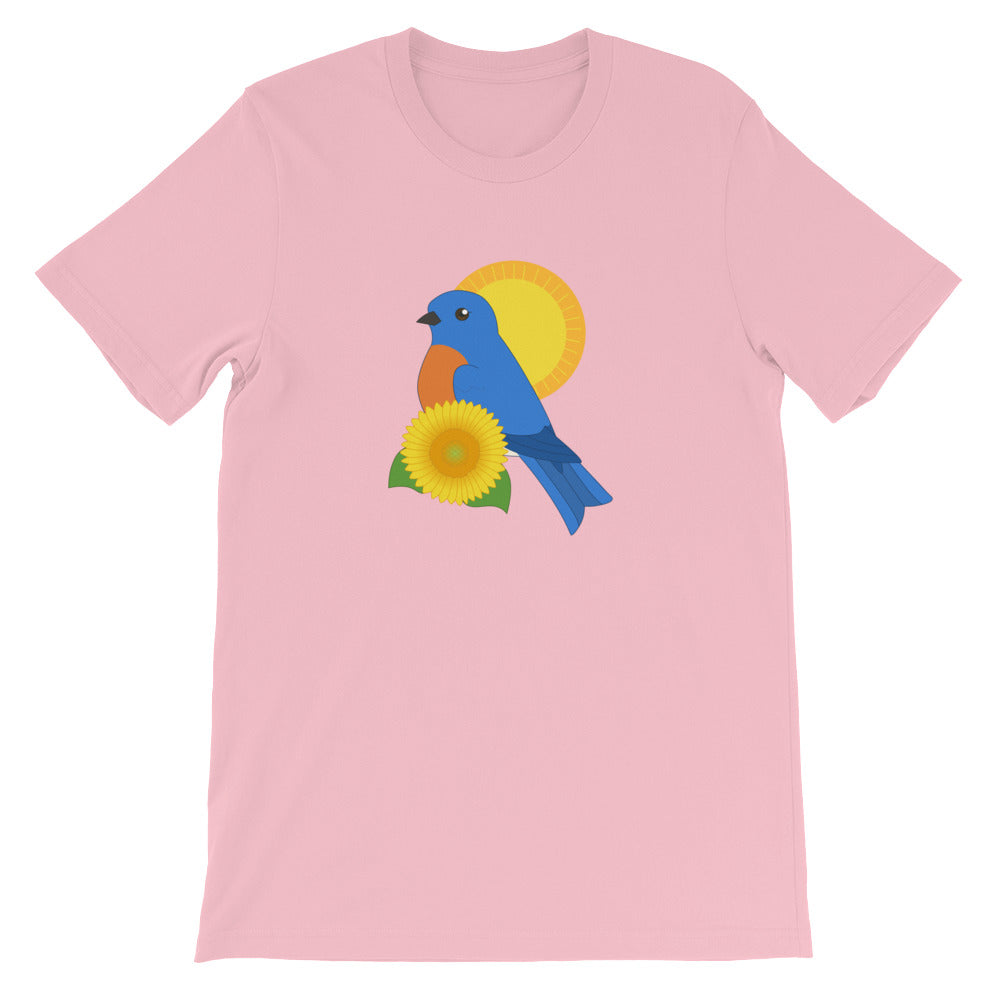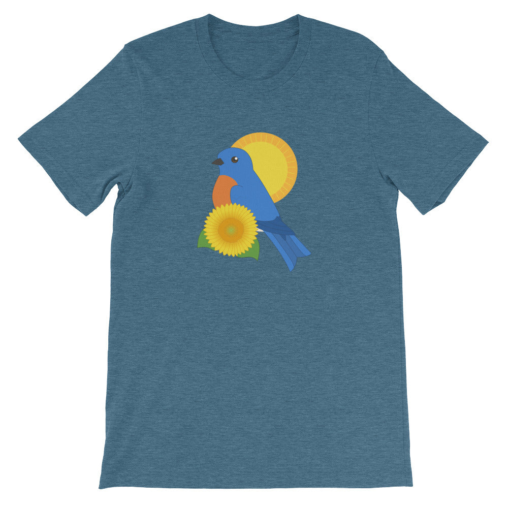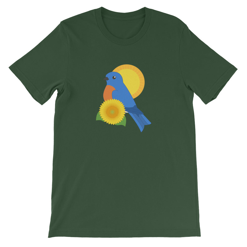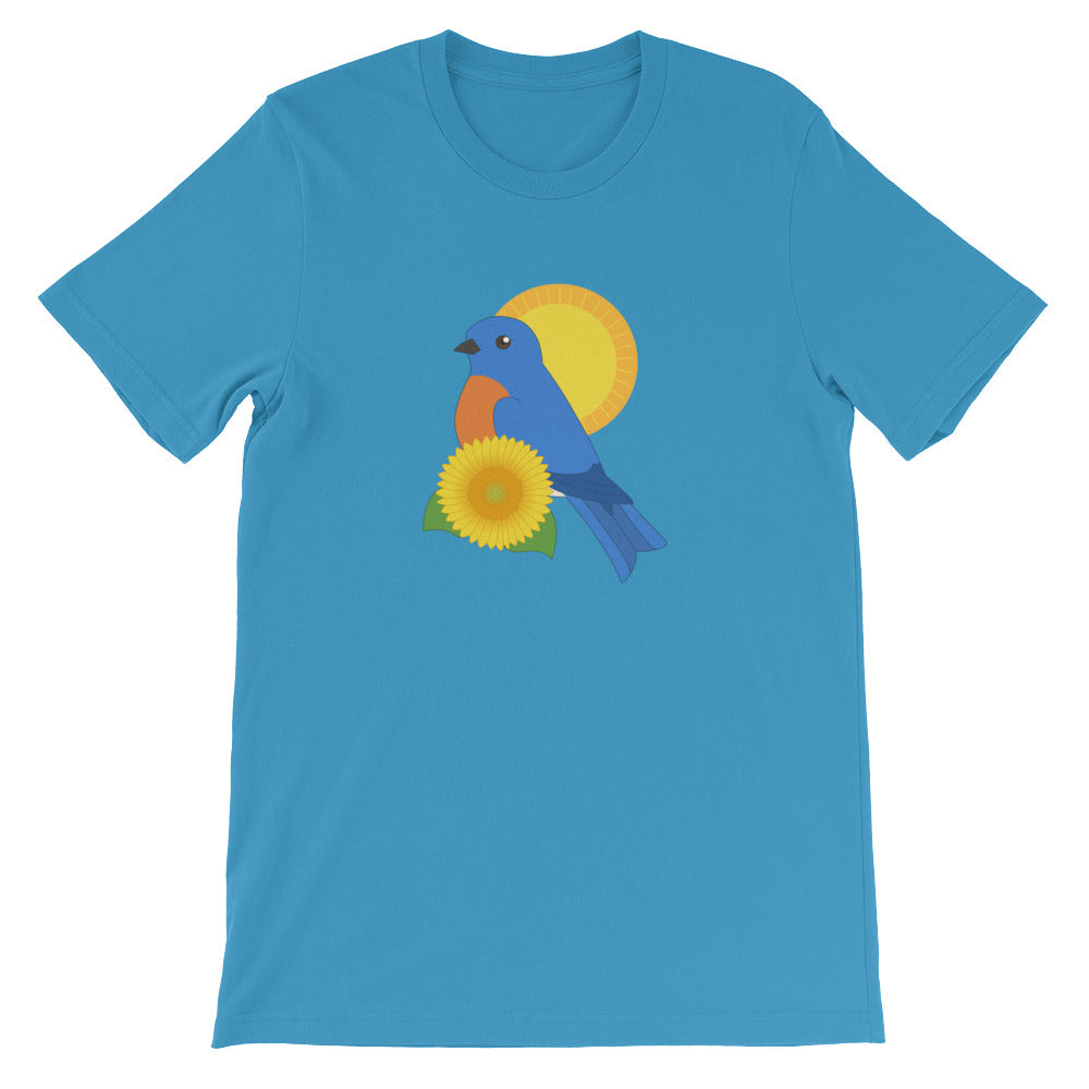 Are you an early bird or a night owl? Showcase your lifestyle with this t-shirt featuring a cute bluebird perched in front of a bright yellow sun.