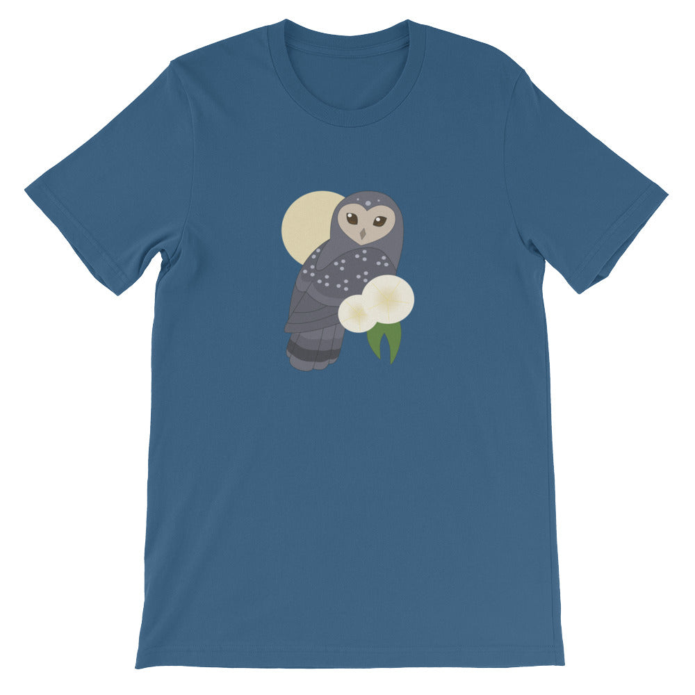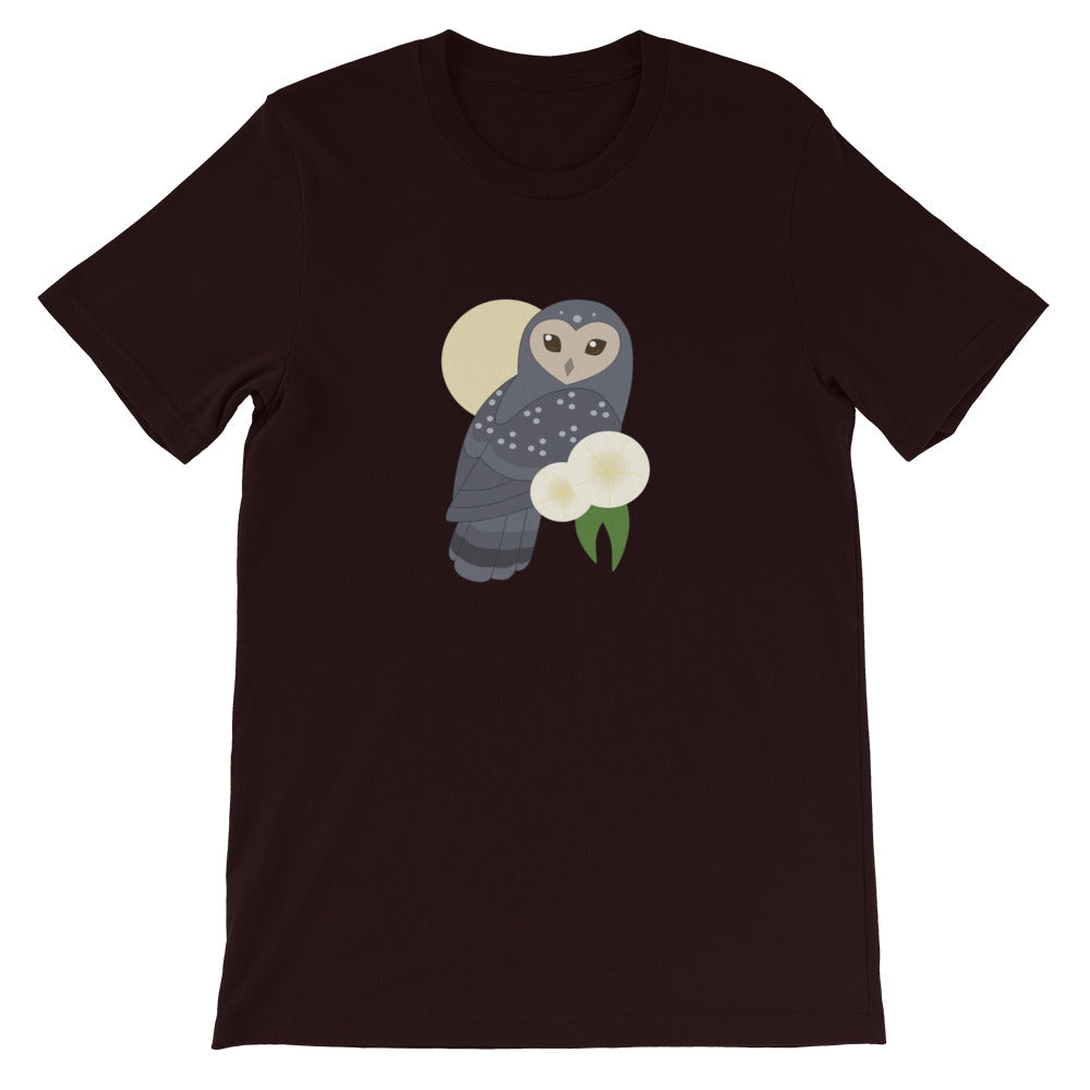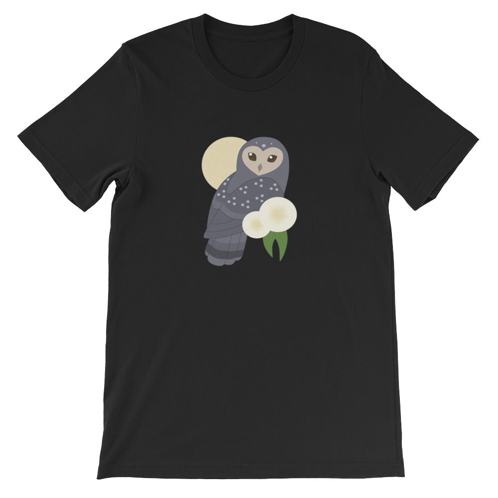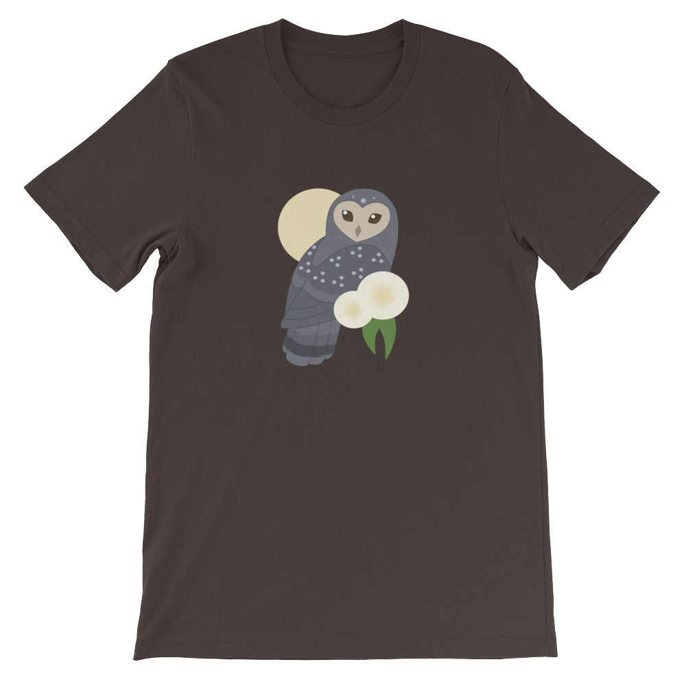 Are you an early bird or a night owl? Showcase your lifestyle with this t-shirt featuring a cute sooty owl perched in front of a pale yellow moon.