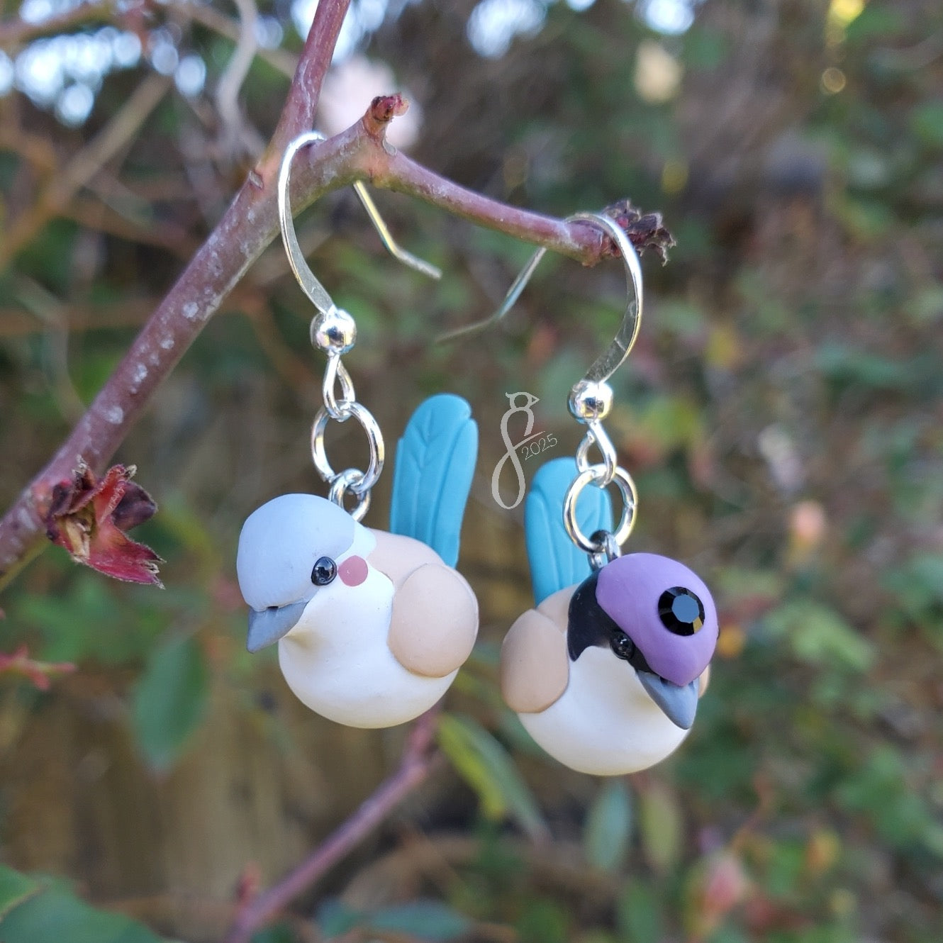 This quirky pair of wrens is ready to embark on their next adventure. They come as a matched set of earrings on silver-plated hoops. Each is approximately 2 cm tall, 2 cm long, and 1.5 cm wide, handmade from polymer clay, wire and resin.