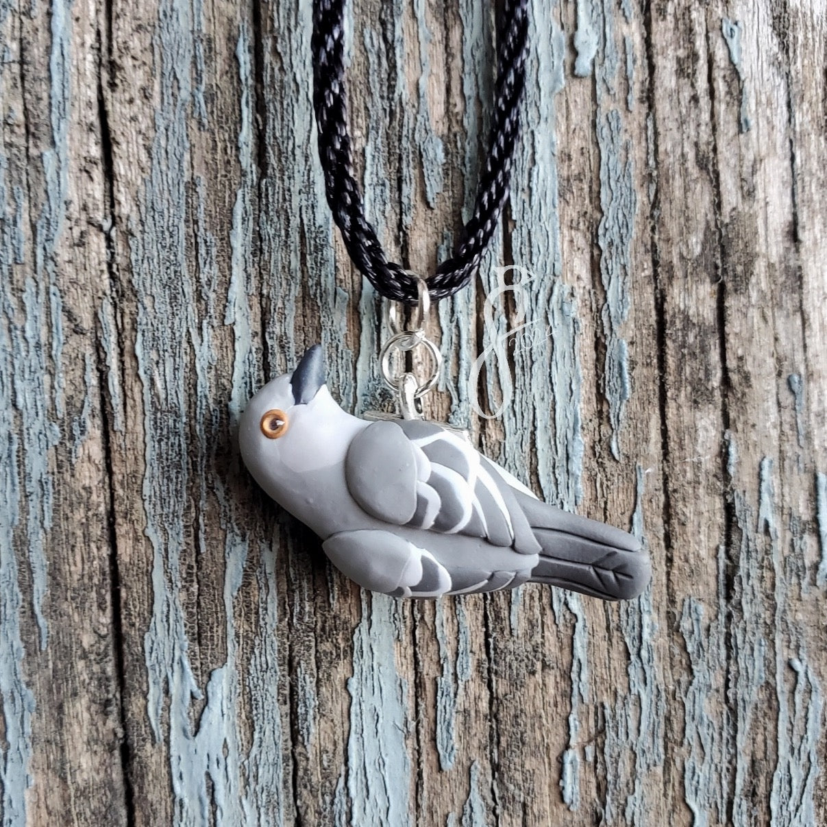 A miniature mockingbird perched on musical notes. This pendant is double-sided and can be worn either direction. He comes on an 18 inch black woven cord with a 2 inch extender chain. Or you can choose to hang him as an ornament.