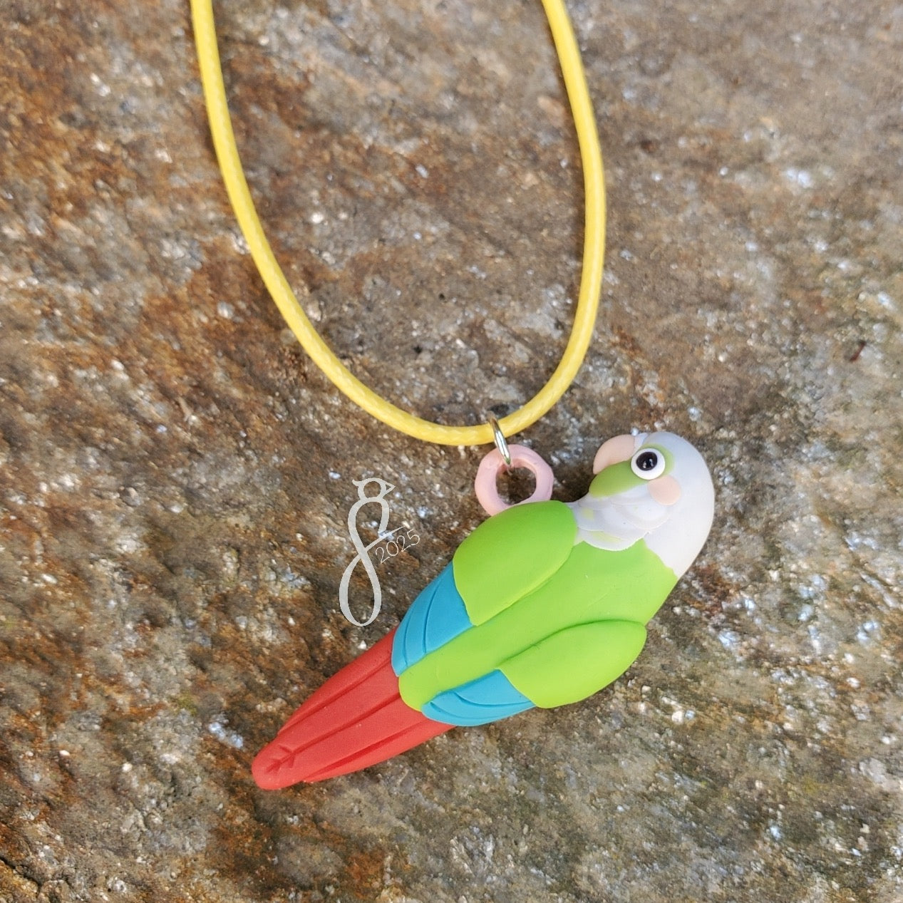 Each pendant is handmade from polymer clay and wire, and comes with an 18 inch woven yellow cord.