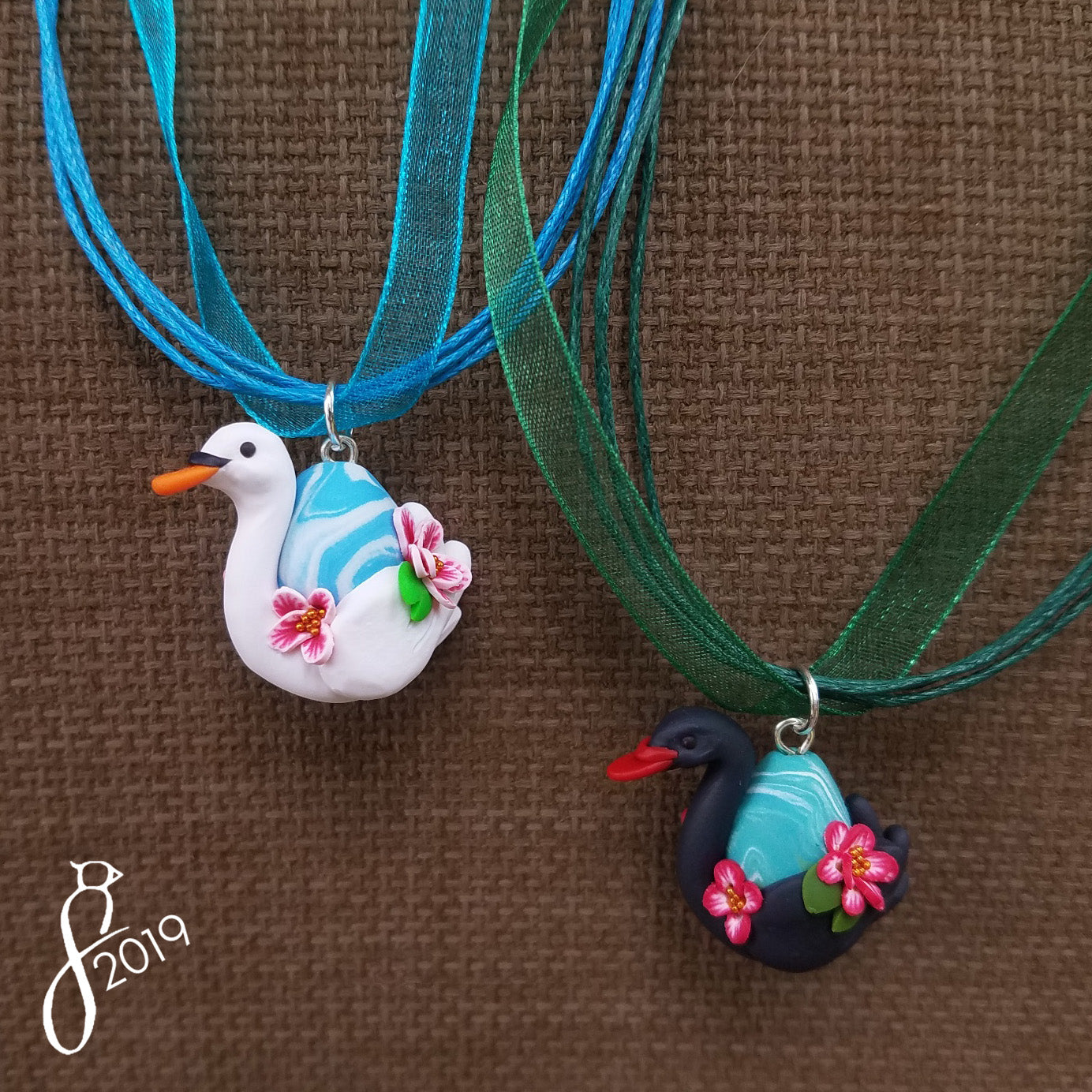 Every pendant comes on a 16 inch cord with decorative ribbon. They have a completely three dimensional design and can be worn from both sides. Each pendant is 2.5 cm tall, 2.5 cm wide, and 2 cm thick, handmade from polymer clay, resin, and microbeads.